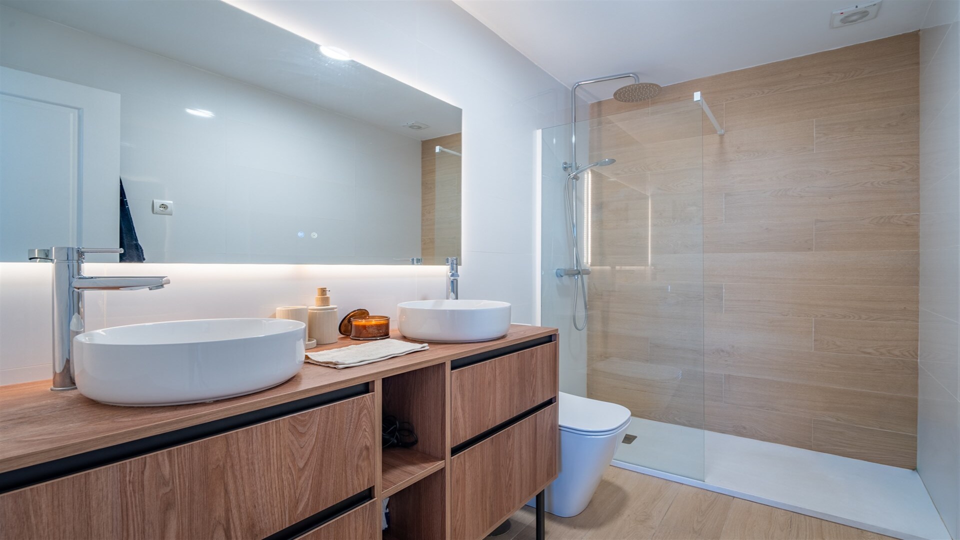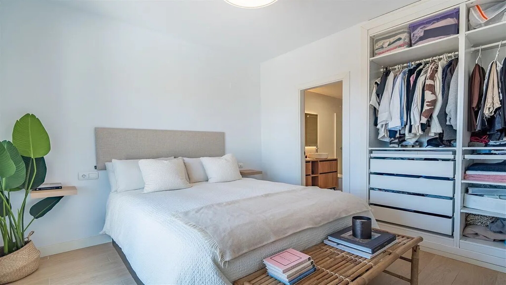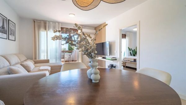 La vivienda cuenta con 68 m² construidos distribuidos de forma eficiente. Dispone de dos dormitorios amplios con armarios empotrados y dos baños en suite, uno de ellos actualmente adaptado como vestidor, con posibilidad de reconversión sencilla a baño completo. El salón-comedor ofrece un espacio moderno, cómodo y luminoso, conectado con una cocina abierta totalmente equipada.