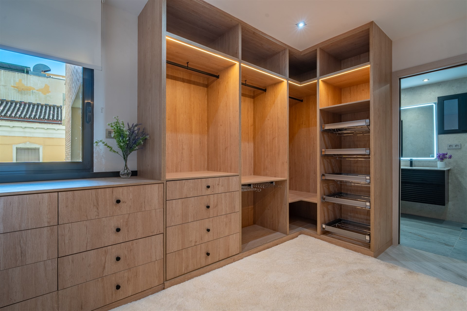 La propiedad dispone de tres dormitorios que destacan por su luminosidad y confort, especialmente el dormitorio principal que cuenta con vestidor y baño en suite. Los otros dormitorios ofrecen versatilidad para adaptarse como habitaciones, despacho o espacio de invitados.