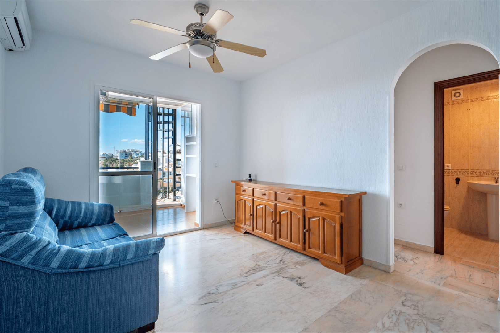 La vivienda se distribuye en una sola planta con un diseño funcional que maximiza cada espacio. Dispone de un salón comedor luminoso con acceso directo a una amplia terraza/solárium privado, ideal para disfrutar del clima mediterráneo y de impresionantes vistas al mar y a la montaña. Esta terraza, cerrada con sistema Lumon, aporta versatilidad para su uso durante todo el año.